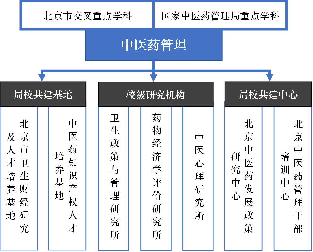 管理学院现有国家中医药管理局重点学科、北京市重点学科(交叉学科)——中医药管理学。2个与北京市卫生局局校共建基地、2个与北京市中医管理局局校共建中心、3个校级研究所。同时,依托北京市哲学社会科学研究基地——北京中医药文化研究基地、教育部全国中医药教育发展中心、国家中医药高等教育研究院、国家中医药发展与战略研究院等校级研究平台开展科学研究与智库服务。