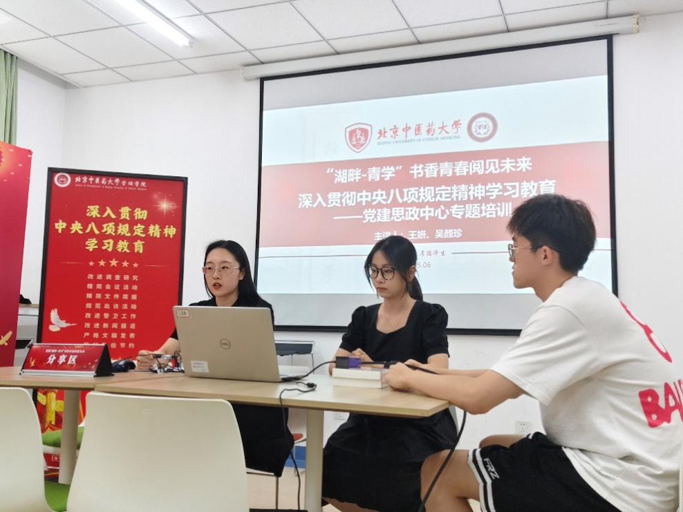 6月6日,支部邀请学院党委副书记周磊为支部全体党员、发展对象讲授《学习中央八项规定精神之党团建设》专题党课。在周磊书记的指导下,一支部强化政治引领,打造以党建带团建的学习模式。6月23日,支部书记王妍、支委吴颜珍在管理学院“湖畔·青学”阅读室,进行《深入贯彻中央八项规定精神学习教育---党建思政中心专题培训》。6月25日,支部副书记范明惠、支委邓杰文为支部全体党员讲授《学习习总书记关于加强党的作风建设的重要论述》主题党课。6月26日,支部书记王妍为一支部全体党员讲授《以中央八项规定精神为纲,筑牢作风建设根基》专题党课。通过分层分类授课,突出抓好学生党员、学生干部学习教育并辐射广大学生,推动中央八项规定精神在学生群体中落地生根。