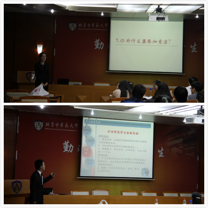6月25日,管理学院2015-2016届学生干部换届竞选大会在中医药博物馆二层报告厅举办。管理学院党委副书记李瑞锋、学生管理办公室张路、团总支书记张瑶萱、学生管理办公室周磊等四位老师,现任团总支副书记王倩、学生会主席鄢铠灵出席活动并担任评委。来自2013级、2014级共20位学生代表担任大众评委。