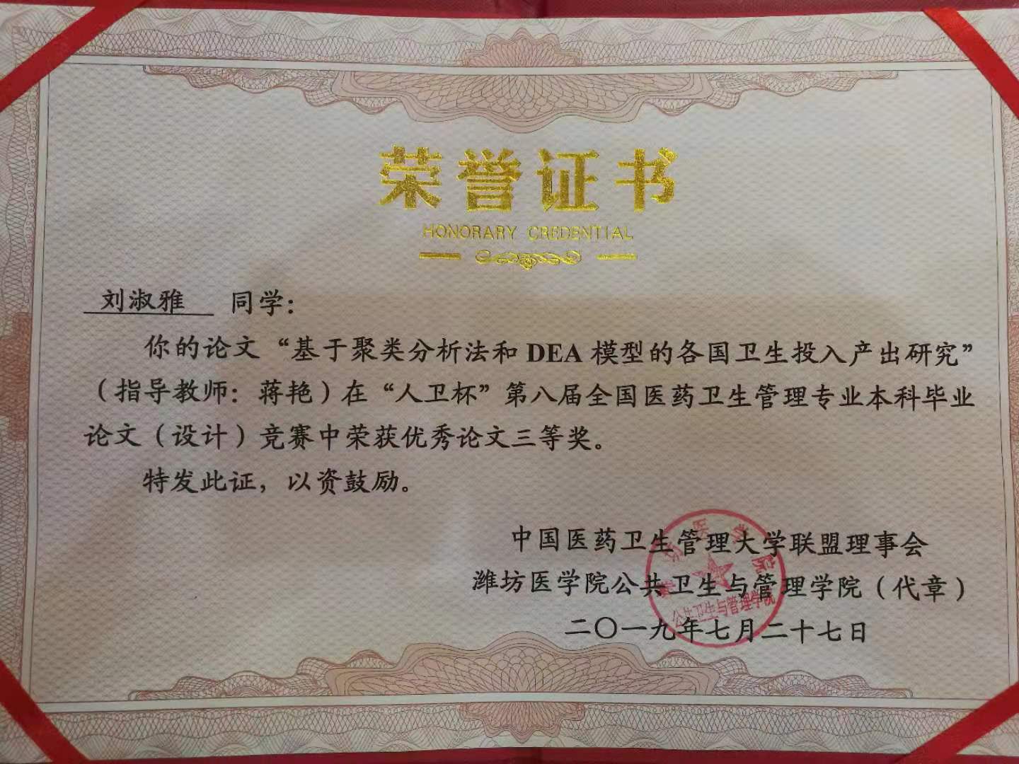 7月26日—7月29日,第十五届“中国医药卫生管理学院院长论坛”在山东省潍坊市举行。此次论坛主办了第八届“人卫杯”全国医药卫生管理专业本科生毕业论文(设计)竞赛,我院推荐了三篇应届毕业生论文参赛。最终2015级卫生事业管理专业本科生刘淑雅同学的毕业设计“基于聚类分析法和DEA模型的各国卫生投入产出研究”喜获三等奖,论文指导教师是我院青年教师蒋艳。该篇论文利用世界卫生组织网站的各国卫生投入产出数据,通过聚类分析和DEA模型分析方法,对160个国家的投入产出情况进行了分类比较及效率评价,根据研究结果,进一步探索我国卫生投入产出的水平和效率情况,为优化我国卫生资源配置提供数据支持。