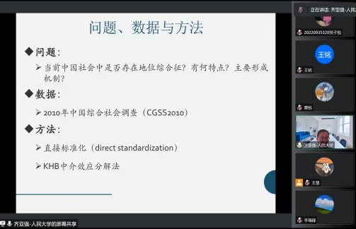 2022年9月22日管理学院博约讲坛邀请中国人民大学社会与人口学院教授、社会学理论与方法研究中心研究员齐亚强教授作主题为“地位综合征——影响健康的社会因素”的报告,本次讲坛采用腾讯会议的形式线上举办,由管理学院李瑞锋院长主持,共130余名师生线上参与并交流互动。