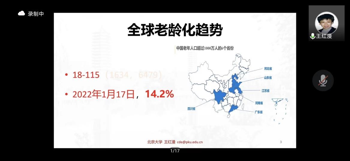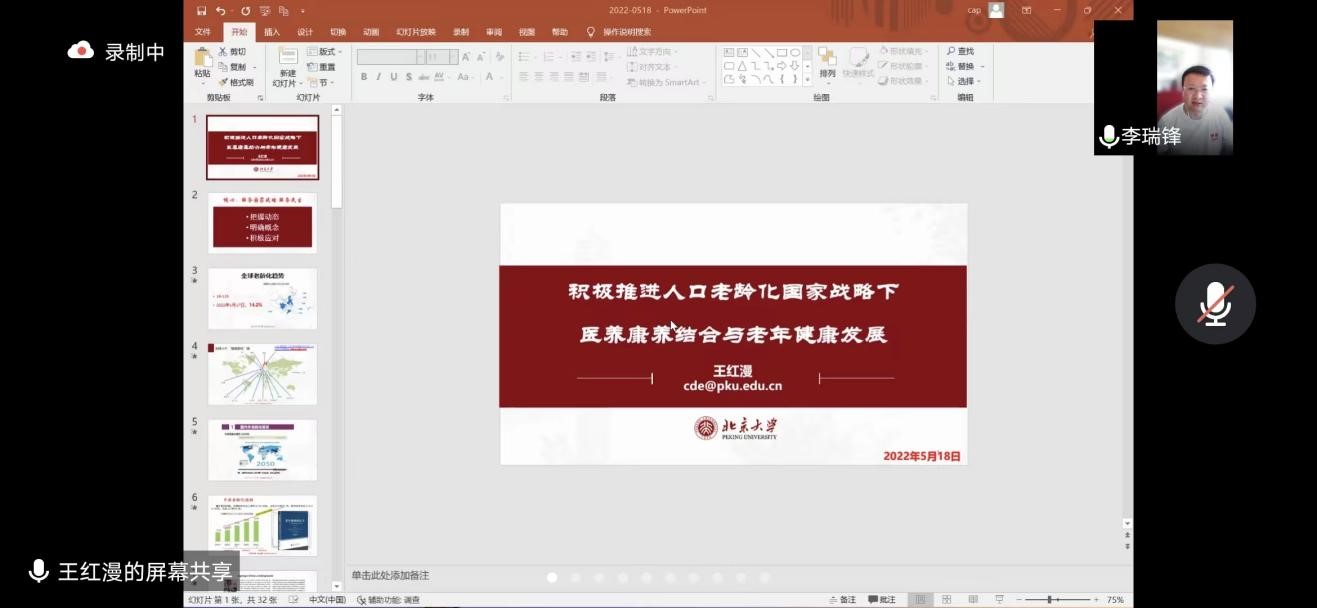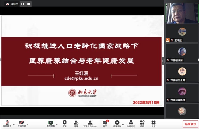 2022年5月18日管理学院博约讲坛邀请到北京大学王红漫教授进行主题为“积极推进人口老龄化国家战略下医养康养结合与老年健康发展”的报告,本次报告以腾讯会议形式线上举办。讲坛由管理学院李瑞锋院长主持,共130多名老师和同学参加。北京中医药大学党委副书记、纪委书记蒋朗朗出席本次讲坛。