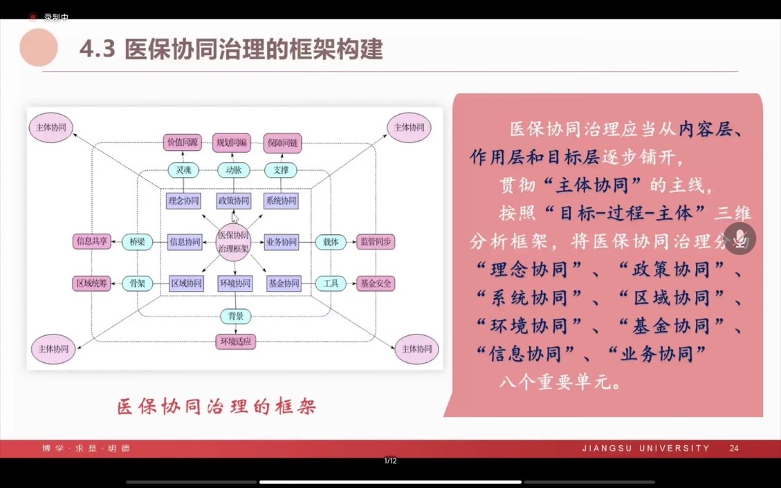 周教授首先从政策支持、研究现状、社会现实等角度对医保协同治理的背景进行了简要阐述,让同学们对医保协同治理有了宏观认识,进而引出包括协同部门间存在地域治理和职能规范双重障碍、多元协同主体间难以形成合力、治理内容碎片化制约运行效率和制度公平等在内的现存医保协同治理问题,分析成因并提出了相关建议。随后,周教授带领同学们一起学习了协同论、博弈论、耗散结构论、突变论等医保协同治理相关理论,对医保协同治理的概念进行了界定,并从多个角度讨论了医保协同治理的时间价值。对于医保协同治理机制,周教授介绍了医保协同治理的生成逻辑、基本原则和医保协同治理框架,重点借助医保协同治理框架对医保协同治理的内容进行了解构。最后,周教授提出了个人对于医保协同治理路径的长期思考,建议建设医保治理共同体,综合考虑和统筹实现医保协同治理的路径。