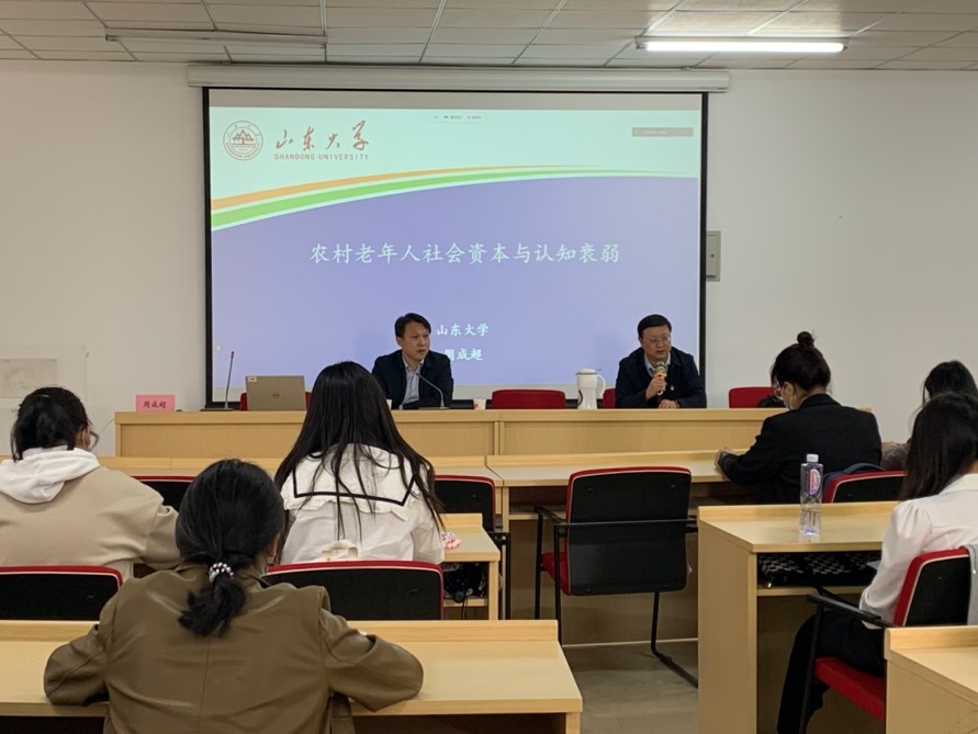 周教授引用习近平总书记“把论文写在祖国大地上”的指示精神,并指出其核心要义为:要解决中国的实际问题。随后周教授介绍了其课题组的主要研究方向和聚焦过程、开展研究工作及未来思路,并着重阐述了“山东农村老年健康队列研究(SREHC)”的研究设计和取得的系列高水平成果,详细介绍了研究方法、研究结果、结论以及政策建议。使同学们对老年人社会资本与认知衰弱这一领域的研究有了全面的认识。